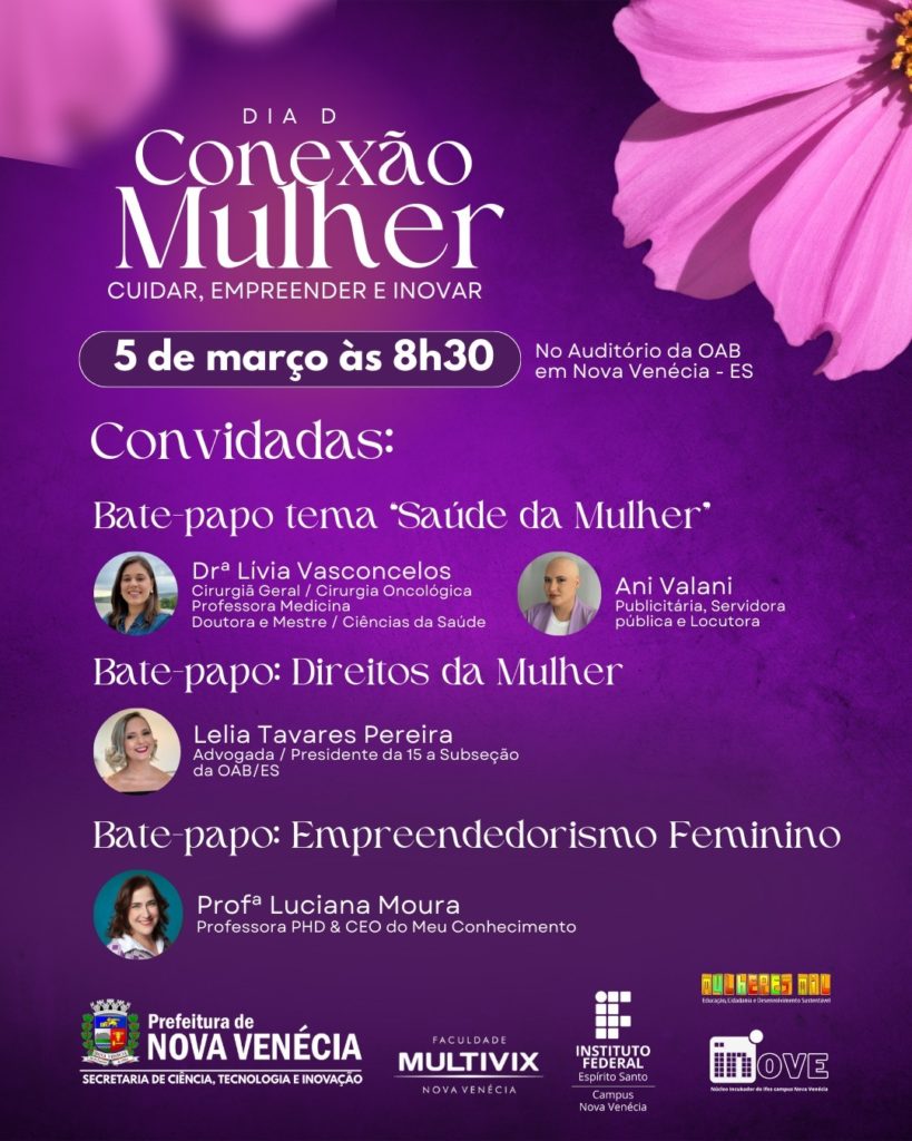 A Prefeitura de Nova Venécia, por meio da Secretaria Municipal de Ciência, Tecnologia e Inovação, convida todas as mulheres venecianas para participar da Conexão Mulher, evento especial em homenagem ao Dia Internacional da Mulher. A programaçã...
