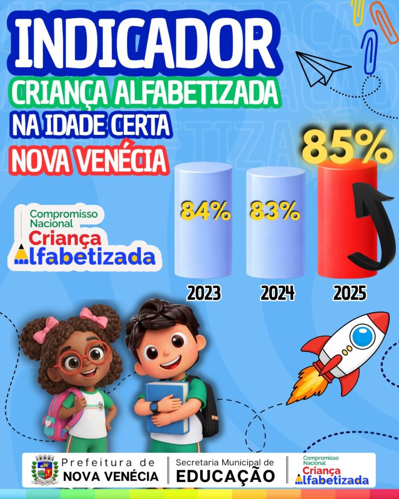 Além disso, os números mostram uma evolução consistente ao longo dos últimos anos. Em 2023, Nova Venécia registrava 84% de crianças alfabetizadas. Em 2024, o índice foi de 83%, e agora, em 2025, o município atingiu 85%, reforçando a tendência de crescimento e melhoria na qualidade da educação.