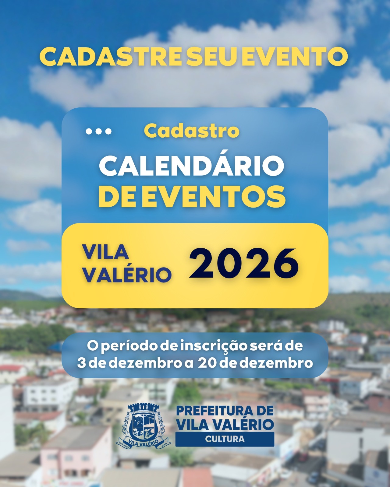 A Prefeitura de Vila Valério, por meio da Secretaria Municipal de Cultura, abriu nesta semana o cadastramento para composição do Calendário Municipal de Eventos 2026. A proposta é reunir, antecipadamente, todas as atividades previstas para o próximo ano, facilitando o planejamento público ...